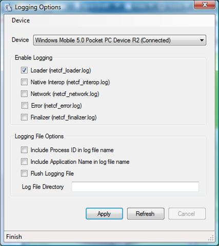 Se empieza por activar usando el Net CF Logging Configuration que es parte de los .NET Compact Framework Powertoys para 3.5.