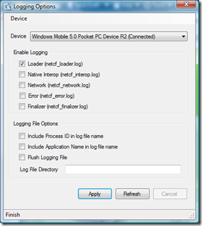 Se empieza por activar usando el Net CF Logging Configuration que es parte de los .NET Compact Framework Powertoys para 3.5.