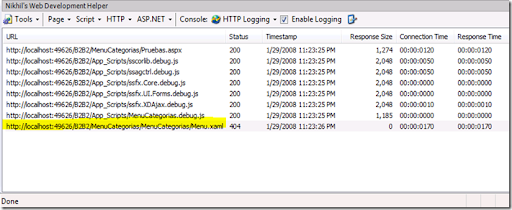 El Web Development Helper es una herramienta muy útil cuando se desarrolla en ASP.NET. En este caso nos muestra con el Http Logging habilitado todos los requests que esta haciendo Interent Explorer, esto nos puede ser muy útil como por ejemplo en este caso para saber porque no estaba cargando el Xaml de una aplicación de Silverlight. Un error muy menso obviamente, pero detactado rápidamente con la herramienta, pudieron haber sido muchas otras cosas, un script que cargaba no cargaba bien el Xaml.